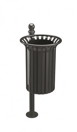 Cestino composto da palo in acciaio zincato a caldo UNI EN 10240 spessore 2mm Ø 60mm altezza totale 1400mm (1200mm per la versione base), dei quali 1200mm fuori terra (1000mm per la versione base), e 200mm per il fissaggio a terra tramite inghisamento, sfera finale in fusione di alluminio per una maggiore resistenza agli agenti atmosferici. Dotato di un sistema di ribaltamento senza ausilio di chiavi per il lavaggio interno.