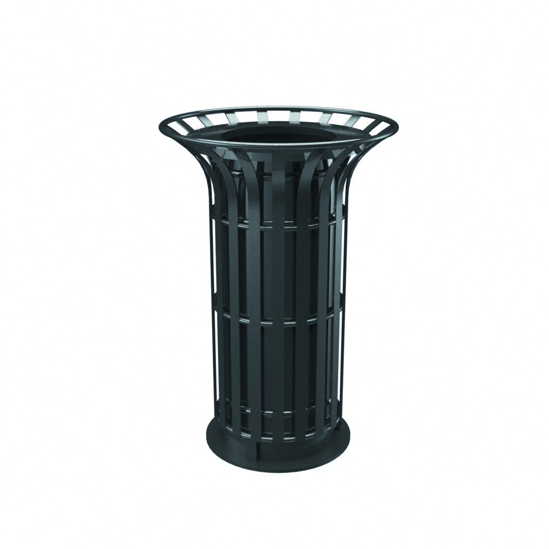 Cestino stradale di forma circolare a basso impatto ambientale, privo di qualsiasi prodotto nocivo e/o tossico, della capacità complessiva di 90 litri. Il coperchio bombato, realizzato in lamiera di acciaio spessore 2 mm, è dotato di bordo di rinforzo e di posacenere in acciaio inox con svuotamento automatico all’apertura. Il coperchio apribile è incernierato al corpo del cestino per agevolare l’introduzione e la fuoriuscita della busta interna. Il corpo del cestino è costituito da un anello superiore in tondino di acciaio Ø 25 mm, saldato a piatti verticali in acciaio 30 x 4 mm, collegati a n. 3 anelli di rinforzo in profilo quadro di acciaio 12 x 12 mm, che garantiscono rigidità strutturale e stabilità complessiva. All’interno è presente un cestino in lamiera di acciaio spessore 1,5 mm della capacità di 60 litri, dotato di bordo antitaglio e forature alla base per lo scarico dell’acqua. Il cestino interno è fissato alla struttura principale mediante viteria in acciaio inox.