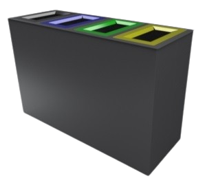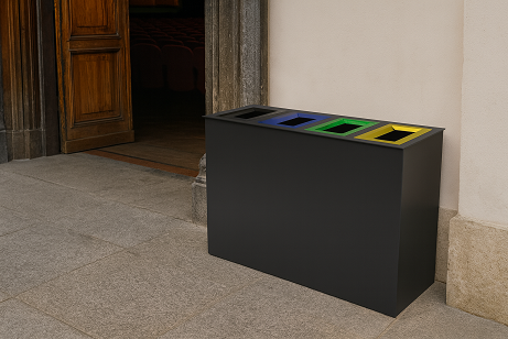 Cestino stradale e da interno rettangolare per la raccolta differenziata, a basso impatto ambientale, privo di qualsiasi sostanza nociva e/o tossica, con capacità complessiva pari a 465 litri. Il corpo è realizzato in lamiera finemente sagomata di spessore 1,5 mm, completo alla base di quattro piedini in gomma con funzione di posizionamento e livellamento. Sui lati sono presenti maniglie ergonomiche per agevolare le operazioni di movimentazione. All’interno sono presenti quattro contenitori in lamiera zincata, ciascuno con capacità di 65 litri cad., provvisti di bordo antitaglio per una maggiore sicurezza durante le operazioni di svuotamento e pulizia. Il coperchio è realizzato con bocche di conferimento colorate (dimensioni 155 x 270 mm) per la corretta identificazione delle diverse tipologie di rifiuto, complete di scritte incise al laser in lingua italiana e inglese. Il coperchio è inoltre dotato di due pistoni a gas che ne facilitano l’apertura e la chiusura durante le operazioni di svuotamento e di serratura a chiave triangolare che consente l’accesso esclusivamente al personale autorizzato.