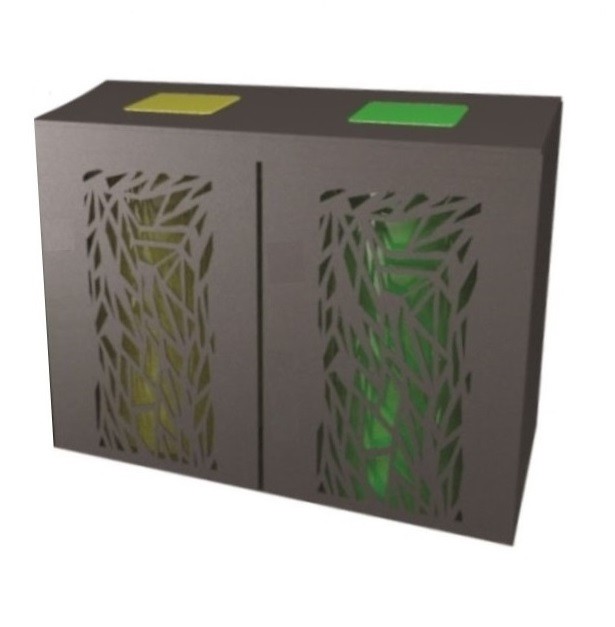 Finitura:Il cestino è costruito in acciaio zincato a caldo e viene dapprima pulito, smerigliato e sgrassato; successivamente gli viene applicato uno strato di fondo primer; infine viene verniciato con polvere poliestere grigio antichizzato tpo Elux, di spessore minimo 160 micron, a mezzo di un processo di polimerizzazione a 180°C, risultando pertanto altamente protetto agli agenti atmosferici. I coperchi basculanti presentano colorazioni diverse, in base alle indicazioni europee, con relative scritte per identificare il rifiuto.